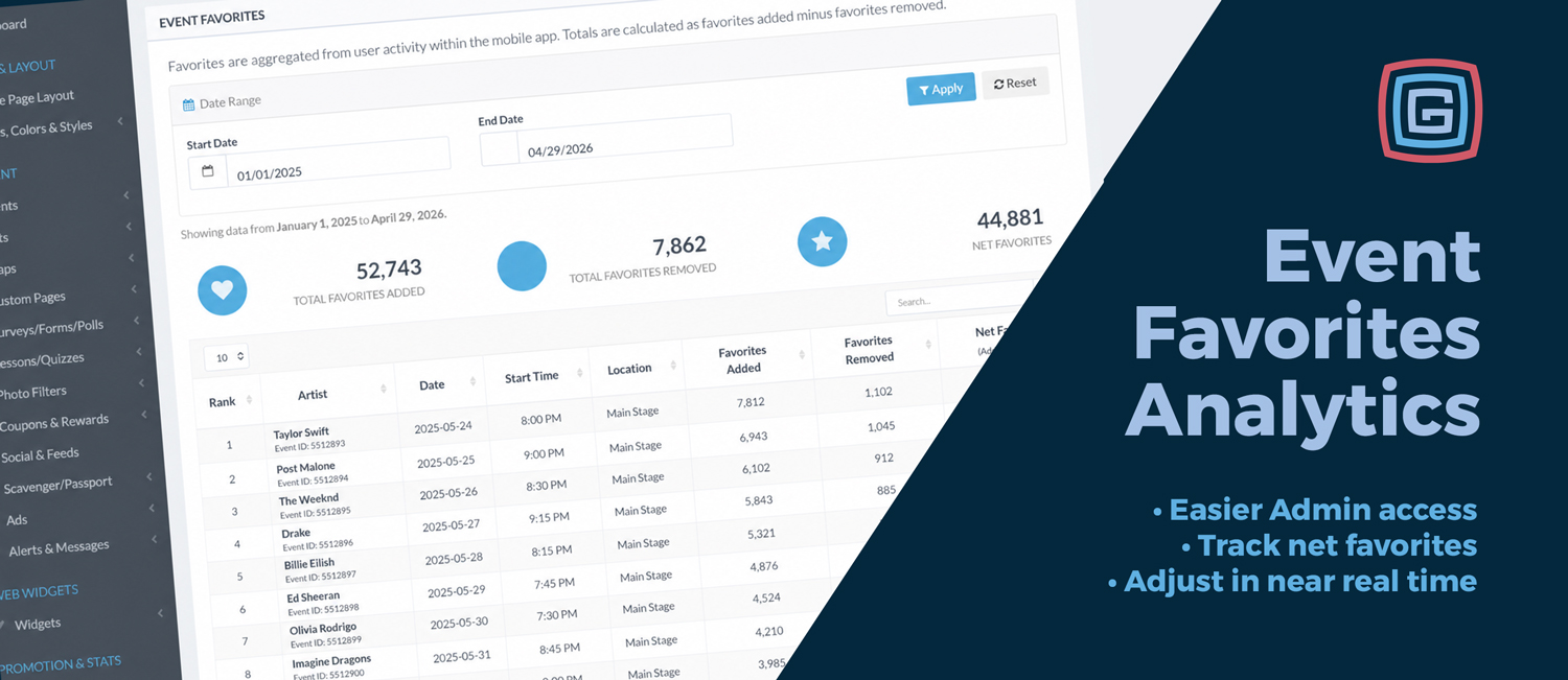 Favorites Analytics has always been available in Grandstand, but it previously lived inside the broader analytics area. Now, it is easier to find, easier to filter, and built directly into the Events section of the Admin.